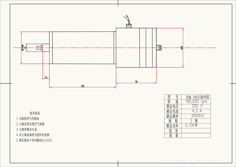 | 軸端動態(tài)偏擺(um) | ≤8 | ≤5 | ≤5 | ≤5 | 一、本主軸使用基本條件: ① 自動換刀結構; ② 采用氣浮軸承支撐; ① 壓力穩(wěn)定、干燥潔凈的壓力空氣; ② 工業(yè)冷卻設備,介質為水或油,達到主軸要求的流量; |